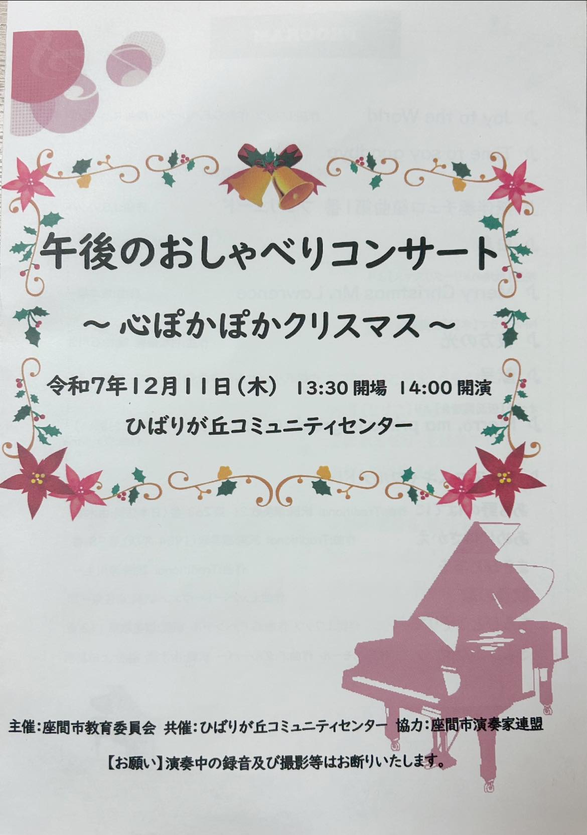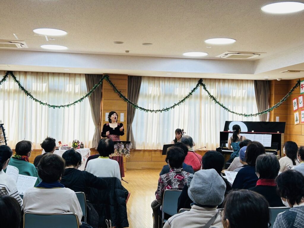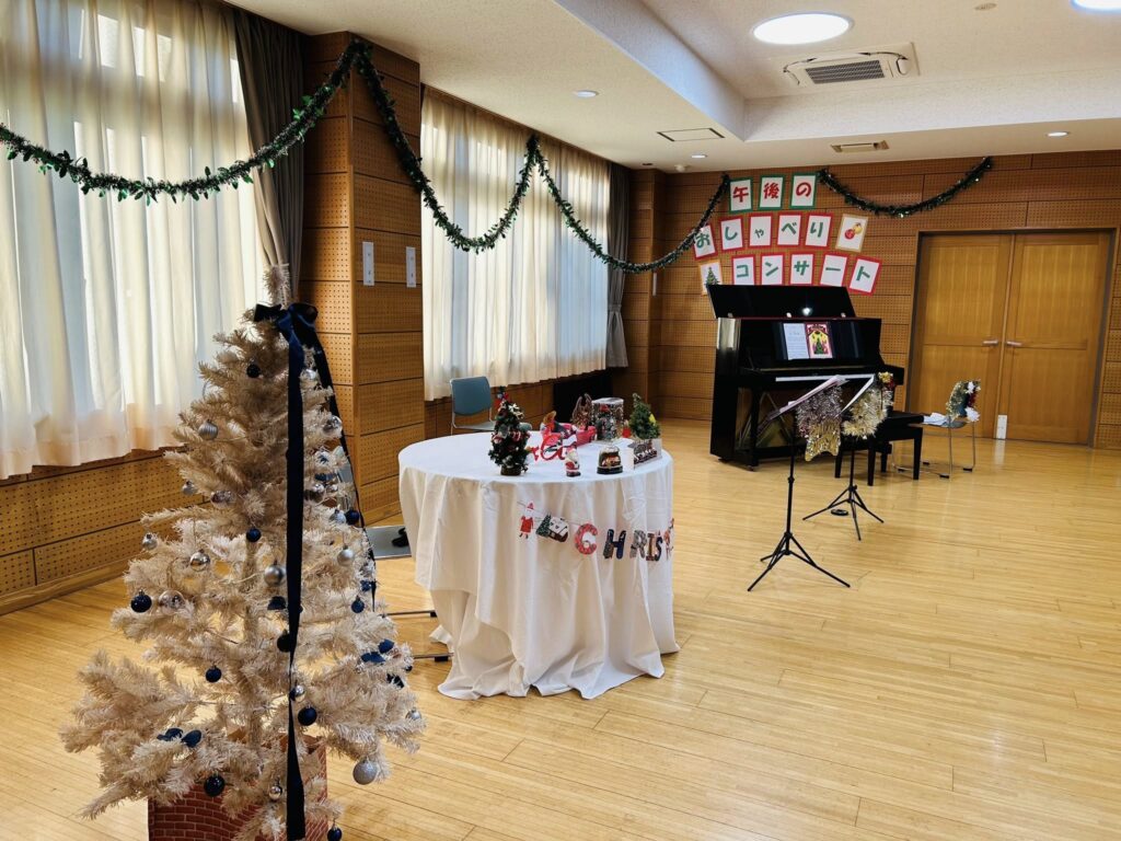 コミュニティセンターの方々が、クリスマス仕様に素敵に飾り付けてくださった会場で、午後の穏やかな空気が流れる中、華々しい雰囲気の「Joy to the world」でコンサートが幕を開けました。