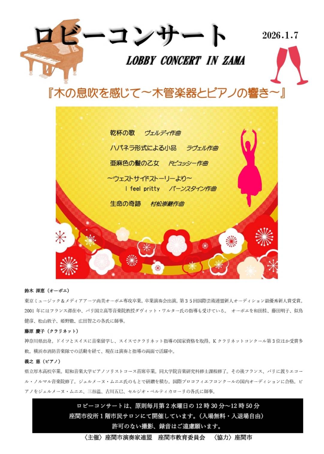 昨年も座間市演奏家連盟の公演にお越しいただき、また温かいご声援を賜りましたこと、会員一同心から感謝申し上げます。