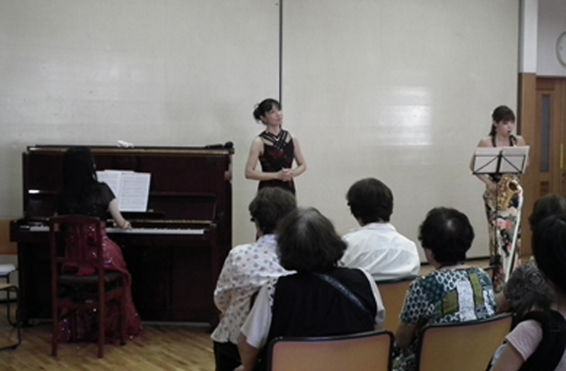 変わらぬ残暑ではありましたが、たくさんのお客様にご来場頂いての「午後のおしゃべりコンサート」でした。地域の皆様に身近に楽しめる音楽を、という私たちの思いそのままに、ご近所の皆様が誘い合ってお出掛け下さったご様子が感じられるあたたかい雰囲気の中、ソプラノ、サキソフォン、ピアノの演奏をお楽しみ頂きました。季節の感じられる曲、オペラアリア、また、演奏者が皆さんにお勧めしたい大好きな曲、また、珍しい曲など、 演奏者のお話をまじえながらの素敵な時間となりました。あたたかく誠実な響きを受け取って頂けたと思います。お客様と演奏者が、近い距離で共に音楽を感じられるコミセンコンサート、これからもどうぞよろしくお願いいたします。